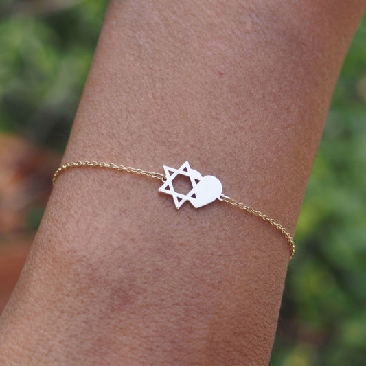 Modern Heritage: 14k Gold Jewish Star & Heart Bracelet | Minimalist Magen David Identity Piece