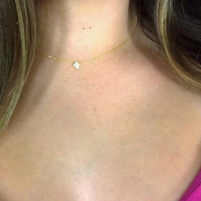 Carry a subtle yet powerful symbol of protection with our Tiny Hamsa CZ Necklace. This delicate necklace features a petite Hamsa charm, intricately detailed and adorned with sparkling cubic zirconia (CZ) stones. It's a beautiful piece that offers both style and a touch of ancient meaning.