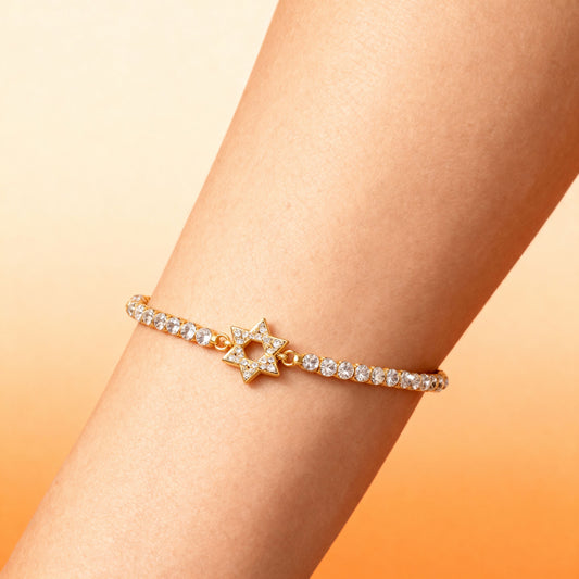 CZ Tennis Bracelet: Pave Star of David Charm & Adjustable Gold