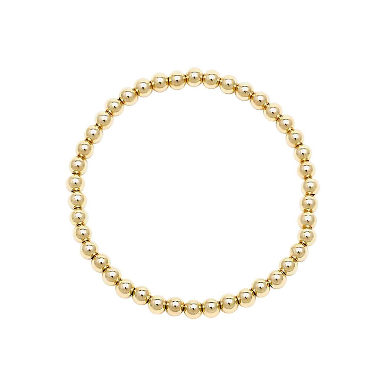 Experience the enduring elegance of our Yellow Gold Beaded Bracelet in a slightly bolder 4mm bead size. Hand-strung on durable jewelry elastic, this piece offers both exceptional comfort and lasting quality. Yellow gold, a timeless symbol of wealth and prosperity, brings a touch of luxury and warmth to any look. Its simple yet sophisticated design makes it a versatile essential, the go-to gold accent you'll want to wear every day, effortlessly complementing any outfit with a touch of refined shine. Enjoy the ease of slide-on comfort, with no tugging or fuss, perfect for those who value convenience. Designed for stacking, wear it solo for a noticeable touch of gold or layer it with your favorites to create your signature look. Crafted with care to fit snugly (6.75" recommended for a standard wrist), this water-safe bracelet is designed for worry-free everyday wear.