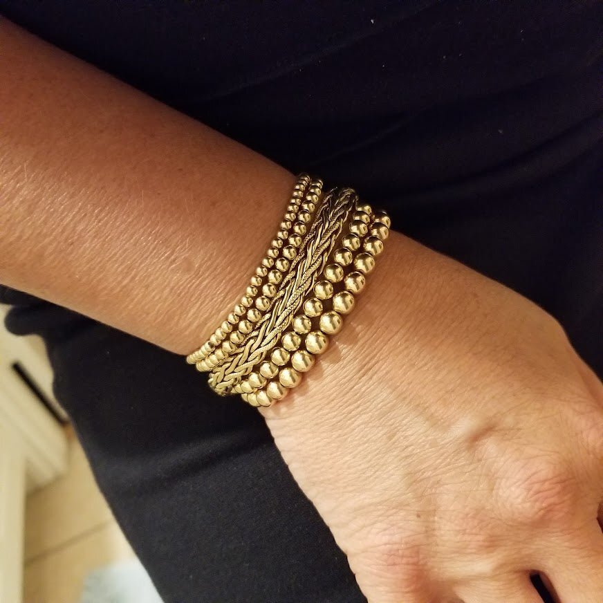 Experience the enduring elegance of our Yellow Gold Beaded Bracelet in a bolder 5mm bead size. Hand-strung on durable jewelry elastic, this piece offers both exceptional comfort and lasting quality. Yellow gold, a timeless symbol of wealth and prosperity, brings a touch of luxury and warmth to any look. Its simple yet sophisticated design makes it a versatile essential, the go-to gold accent you'll want to wear every day, effortlessly complementing any outfit with a touch of refined shine. Enjoy the ease of slide-on comfort, with no tugging or fuss, perfect for those who value convenience. Designed for stacking, wear it solo for a noticeable touch of gold or layer it with your favorites to create your signature look. Crafted with care to fit snugly (6.75" recommended for a standard wrist), this water-safe bracelet is designed for worry-free everyday wear.