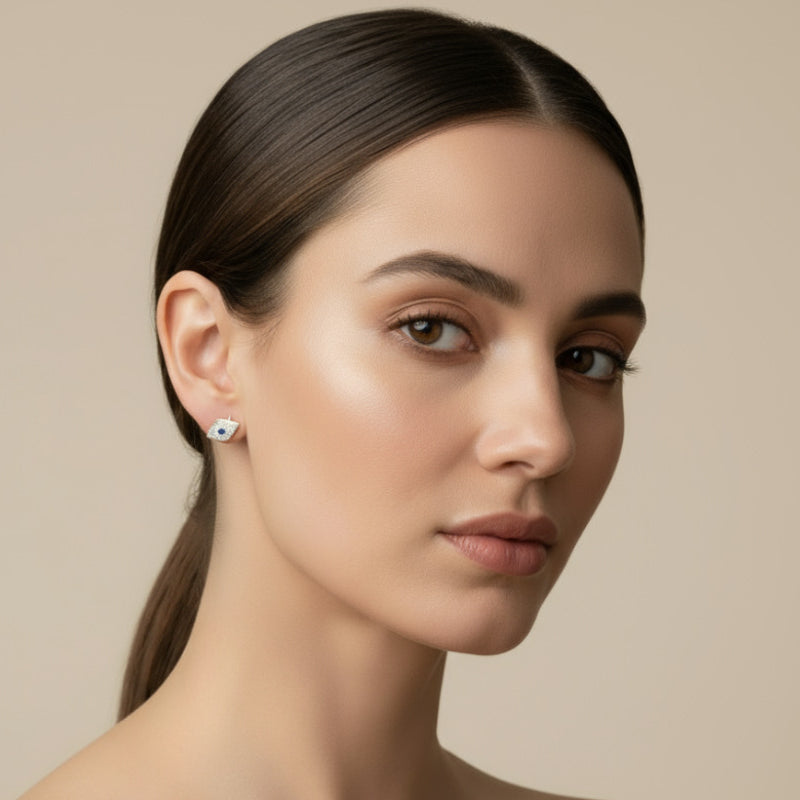 Single blue sapphire, the color and gemstone for luck sits in the center of the evil eye earrings. Full cut, elegant diamonds surround the middle stone. Playing with the light, the gems sparkle and dance with each movement of your body.