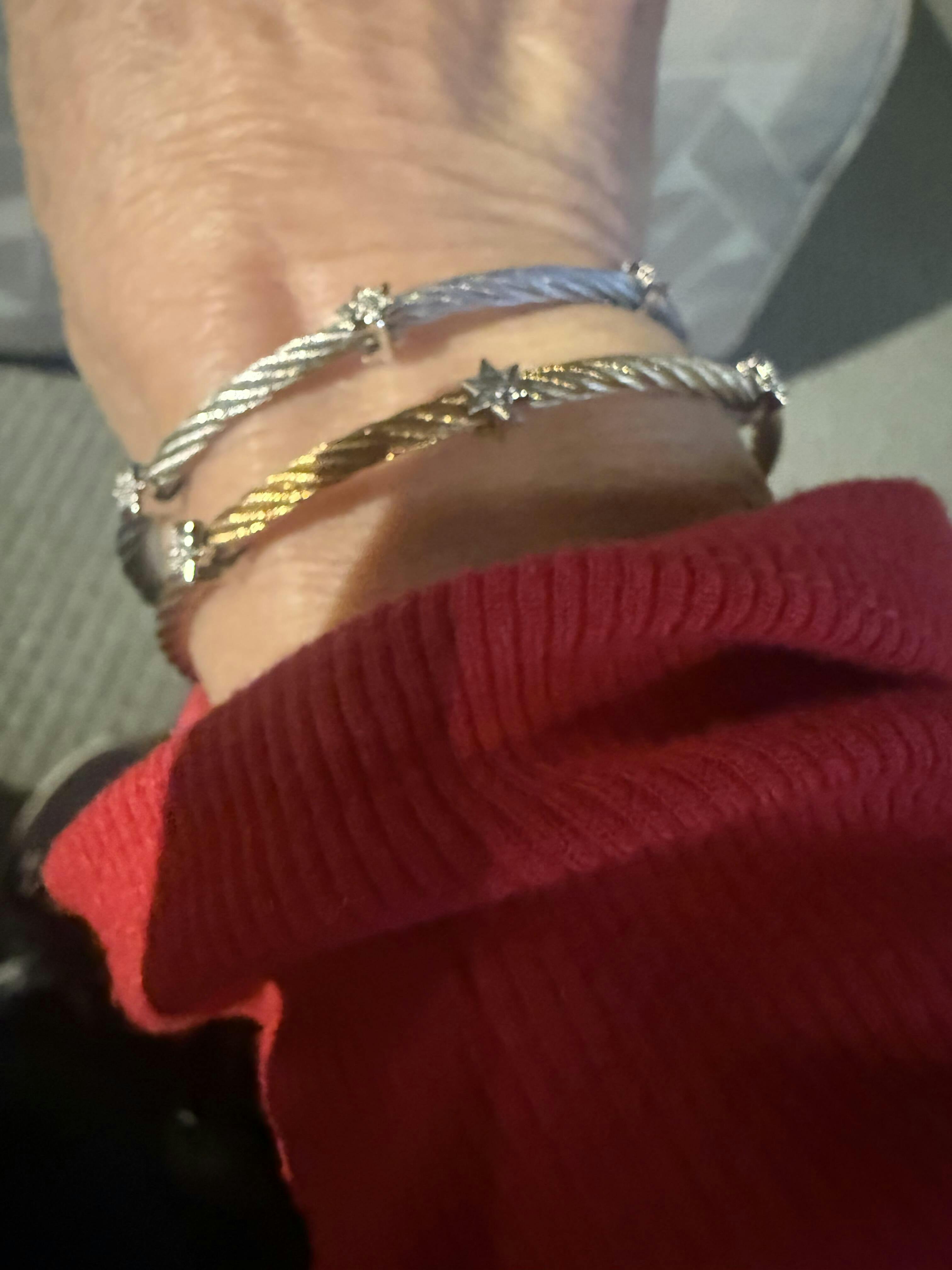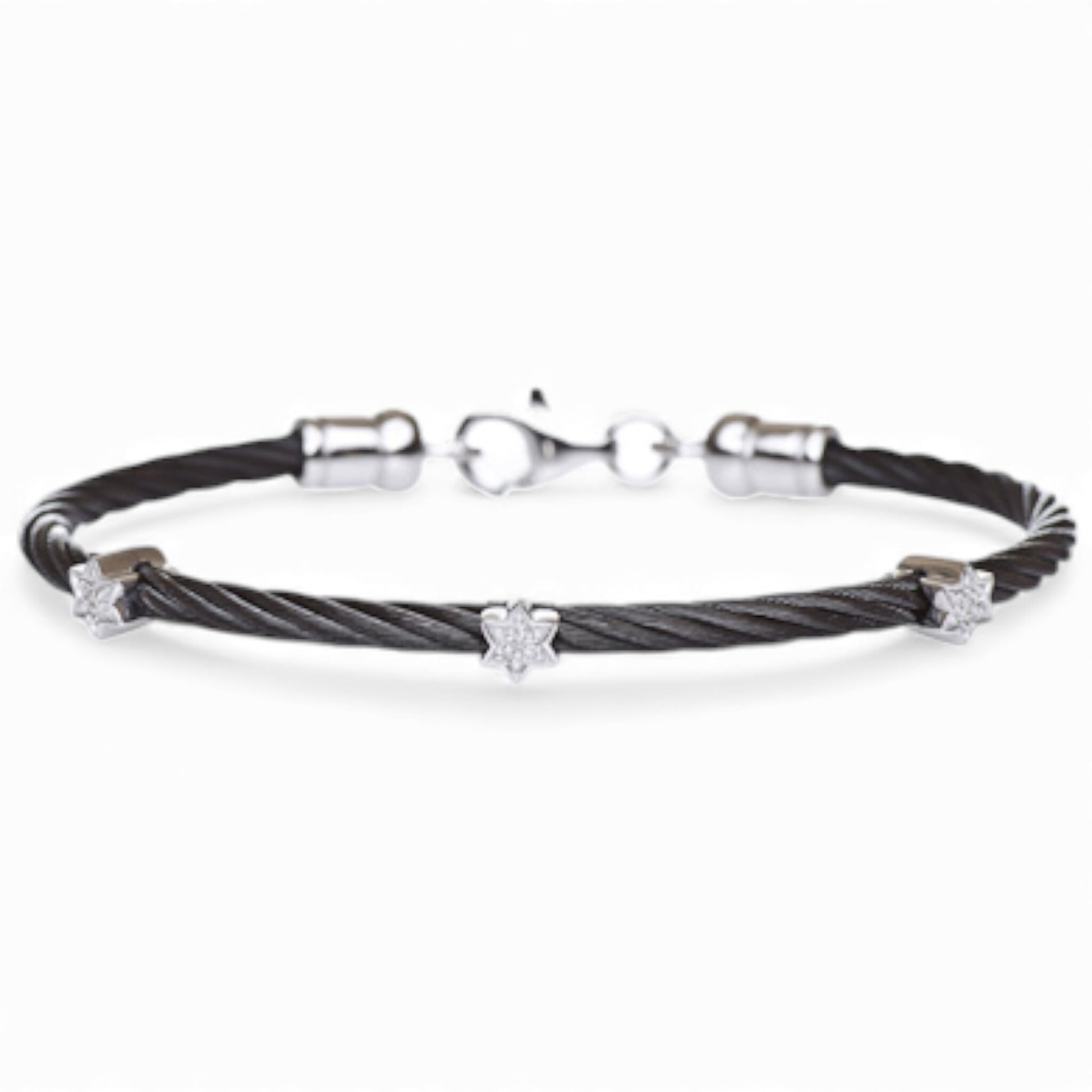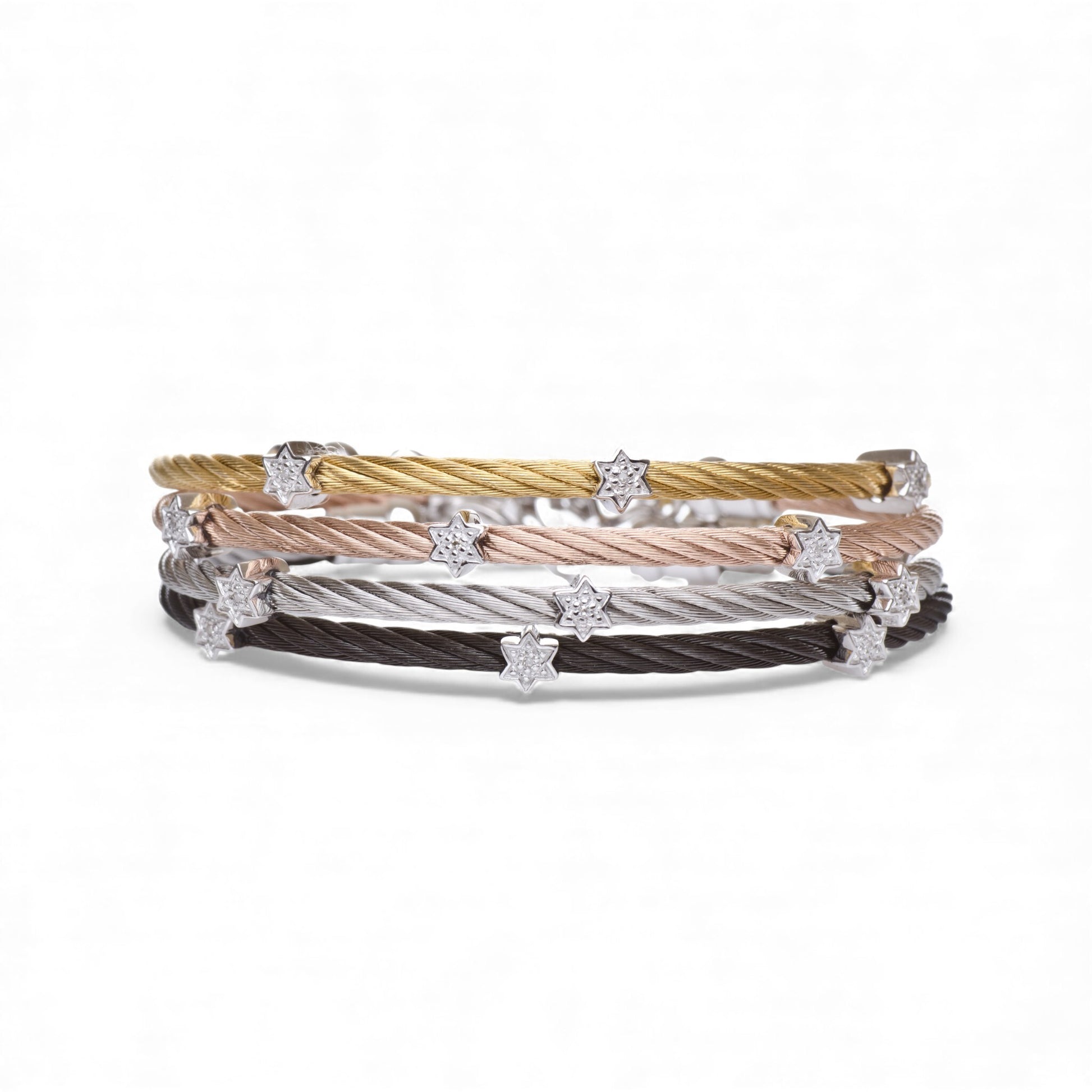Each cable bracelet has three Stars of David, each set with diamonds. Safe enough to wear all the time so don't be afraid to swim, shower, or sleep in these.