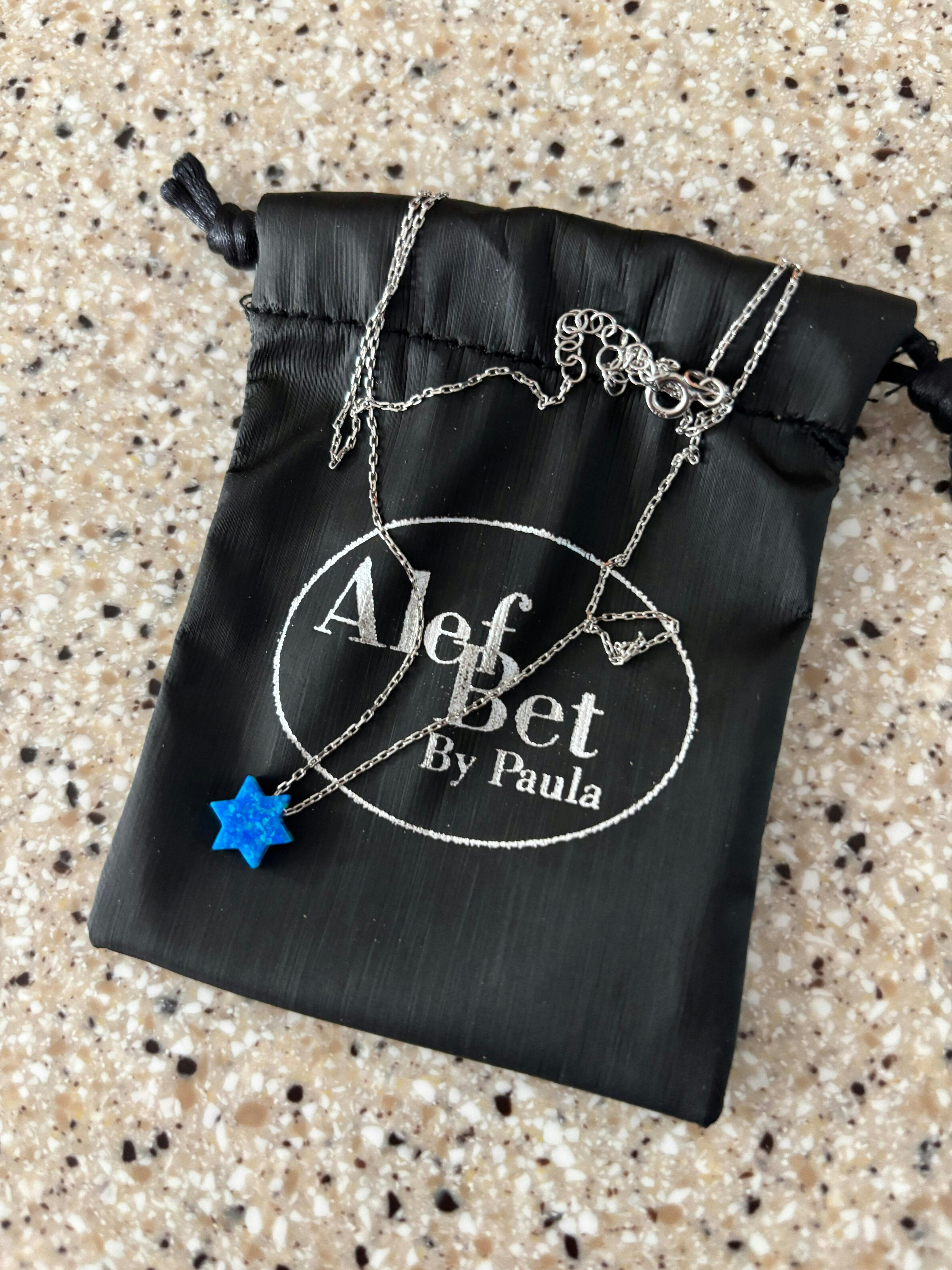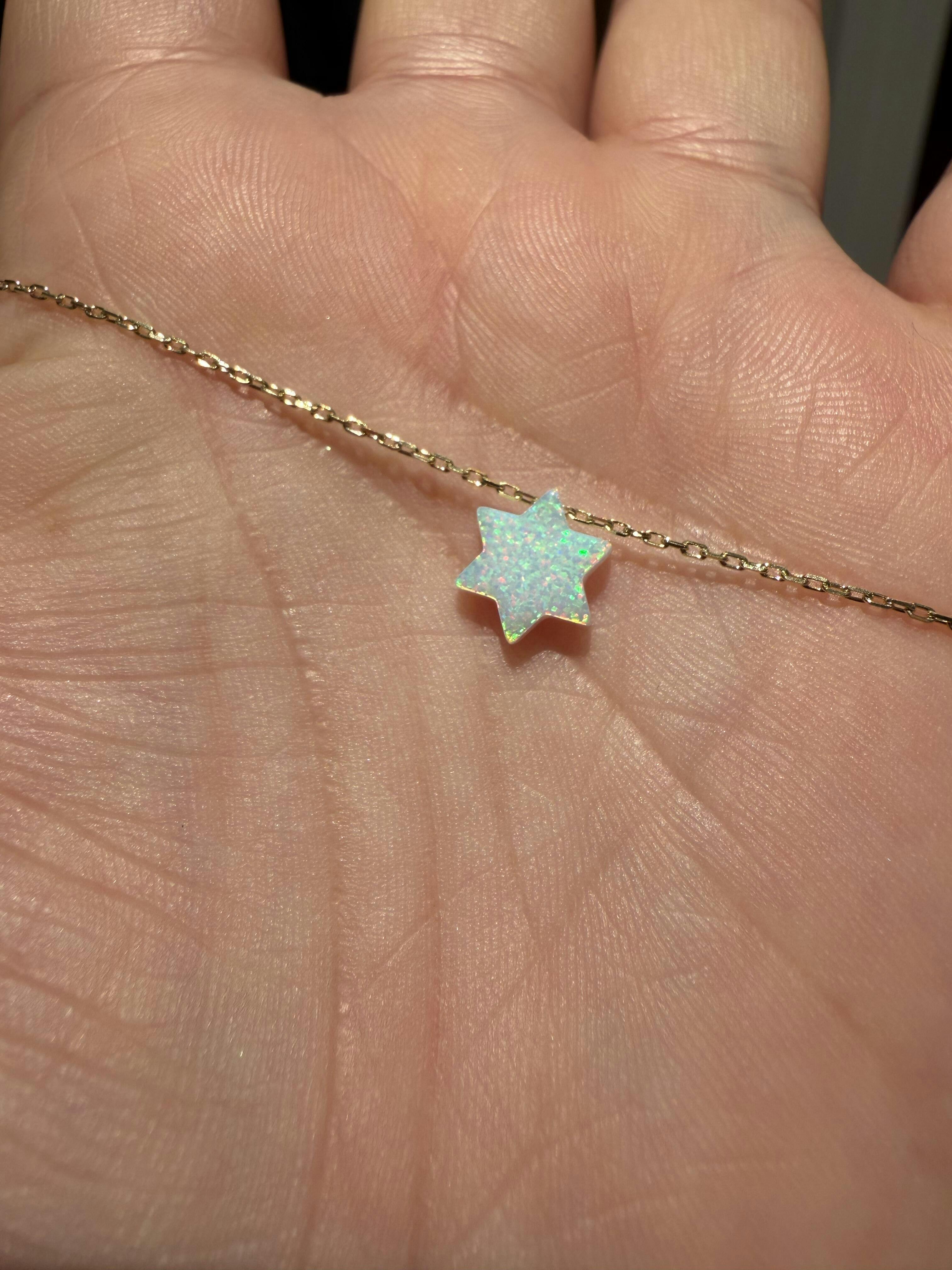 Opal Star of David necklace with specks of different colorful hues. Opal is a stone of hope, love, and great achievement.