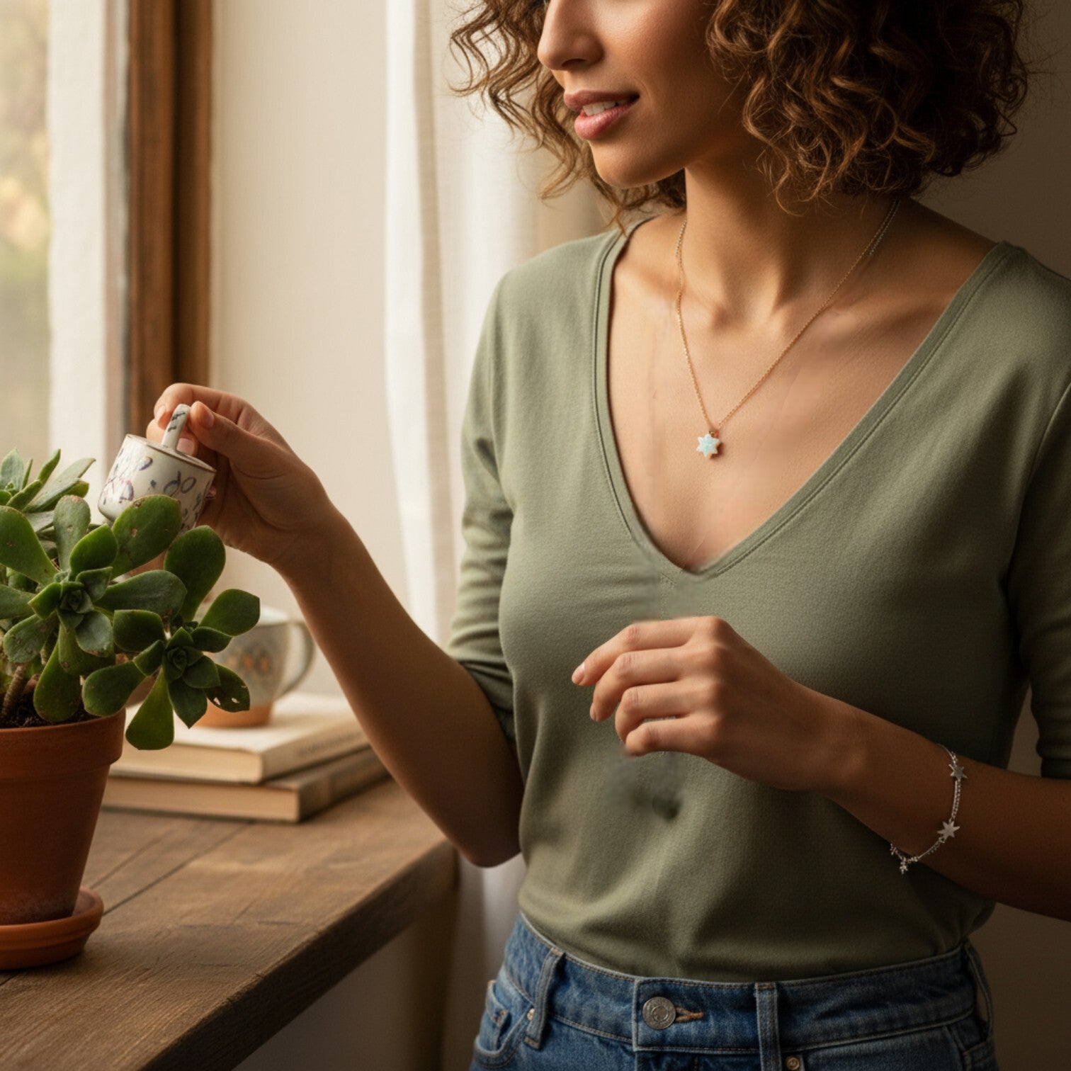 Most of our sterling silver and 14k gold pieces are water-safe for everyday activities like showering and swimming. However, we recommend removing your jewelry before using harsh chemicals or soaps to maintain its beauty. For red string bracelet designs, we suggest keeping them dry to prolong their lifespan.