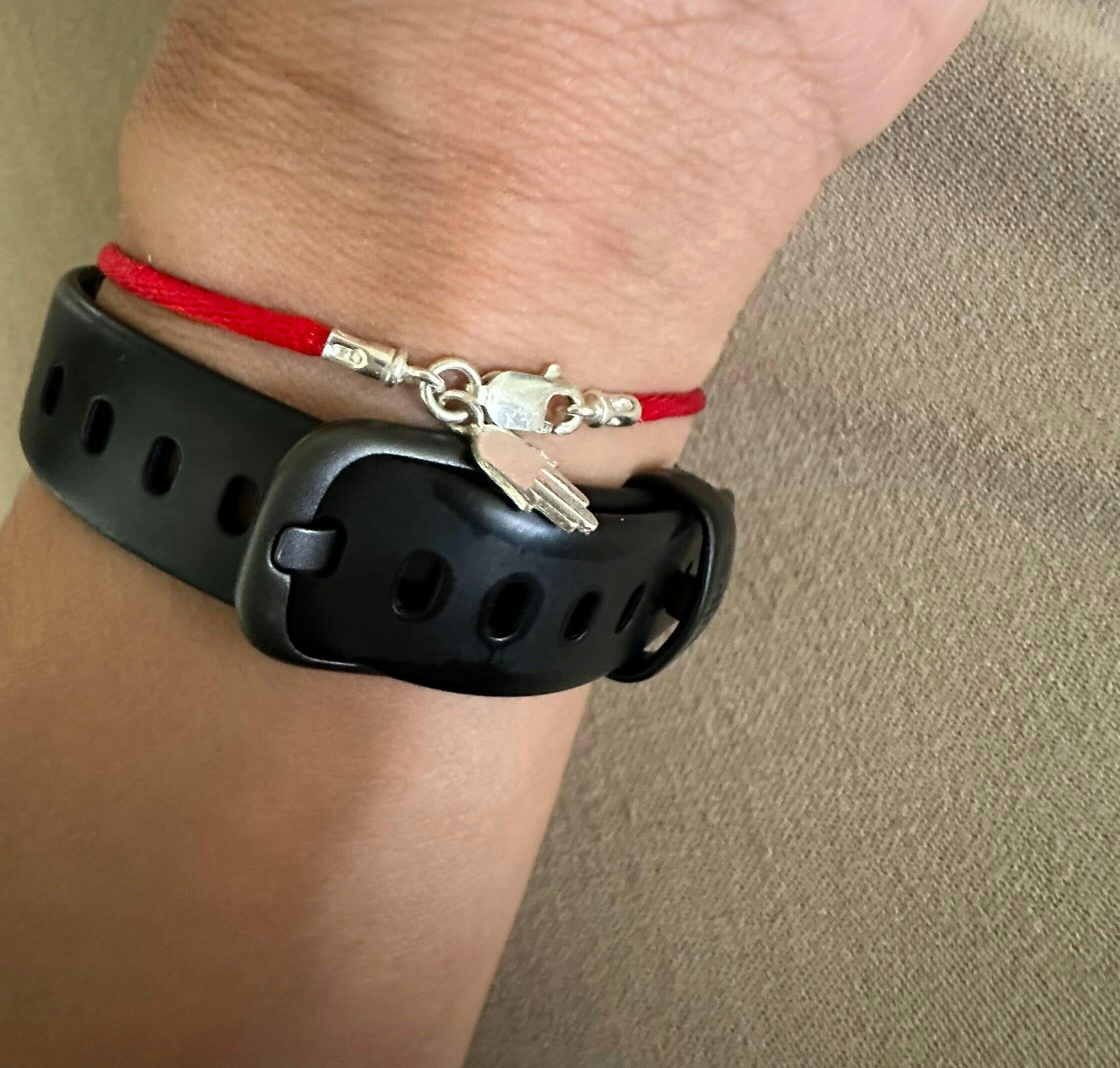 A hamsa charm and red string bracelet, symbolizing protection and good wishes, made of durable sterling silver. Ideal gift for any occasion.