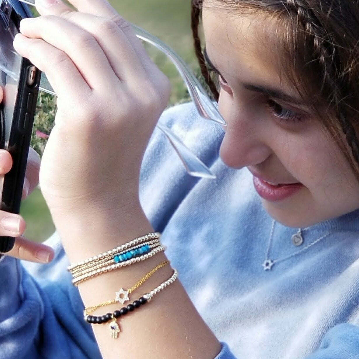 Most of our sterling silver and 14k gold pieces are water-safe for everyday activities like showering and swimming. However, we recommend removing your jewelry before using harsh chemicals or soaps to maintain its beauty. For red string bracelet designs, we suggest keeping them dry to prolong their lifespan.