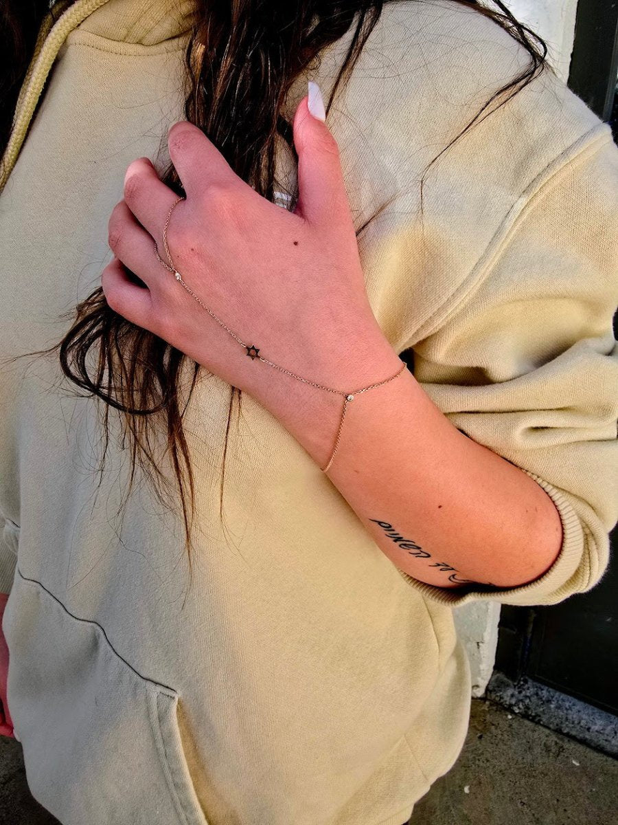 Want a piece of jewelry that's both beautiful and meaningful? This Jewish star hand chain bracelet is just the thing! It's a gorgeous way to express your faith and add a touch of sparkle to your look. Imagine how it will feel to wear this bracelet, a delicate reminder of your heritage and beliefs, glittering gently on your hand. It's the perfect piece to add a touch of elegance to your everyday, and a thoughtful gift for someone you cherish.