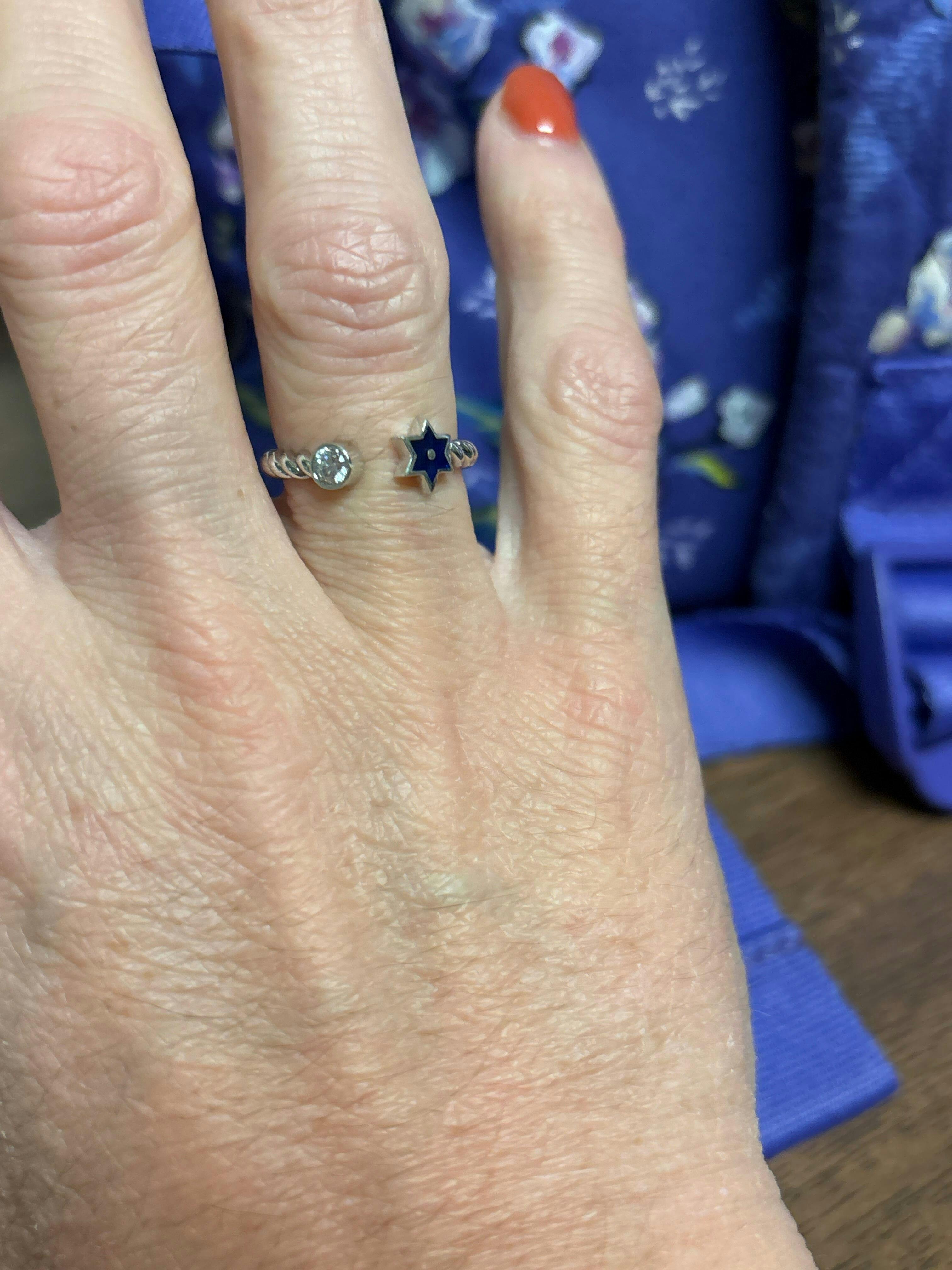 An adjustable Jewish star of David ring is designed in sterling silver with a sparkling, single bezel set gemstone on one side.