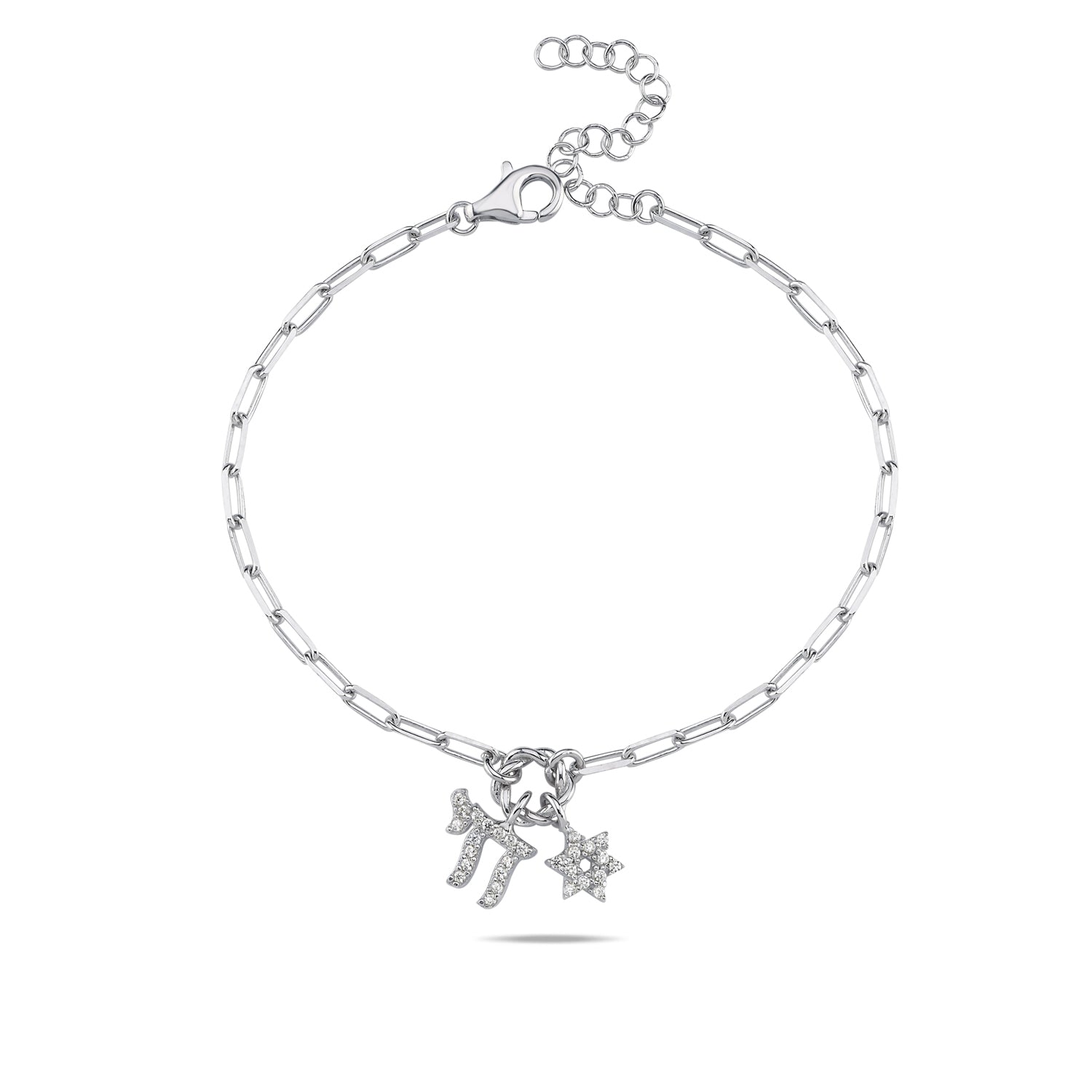 Chai & Jewish Star Cluster Bracelet: Yellow Gold Plated or Sterling Silver with Sparkling CZ Gems