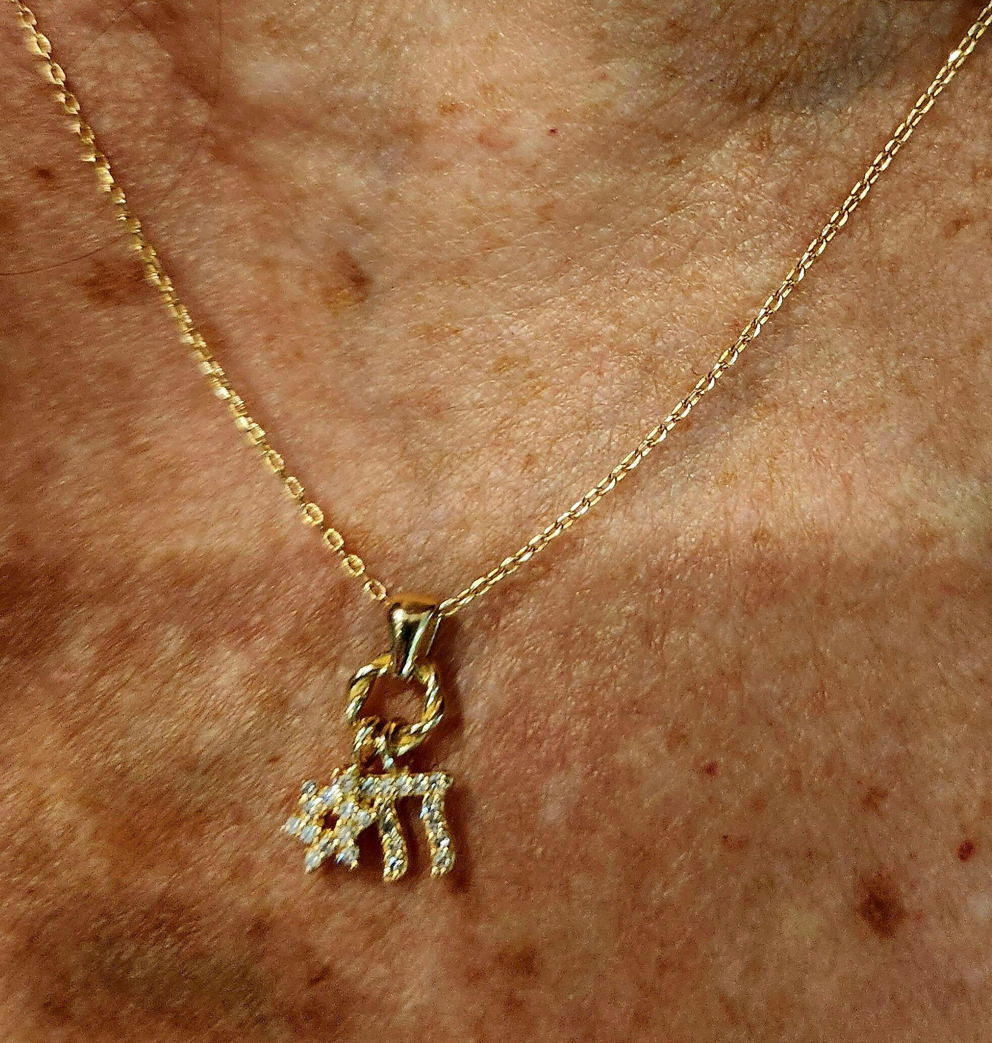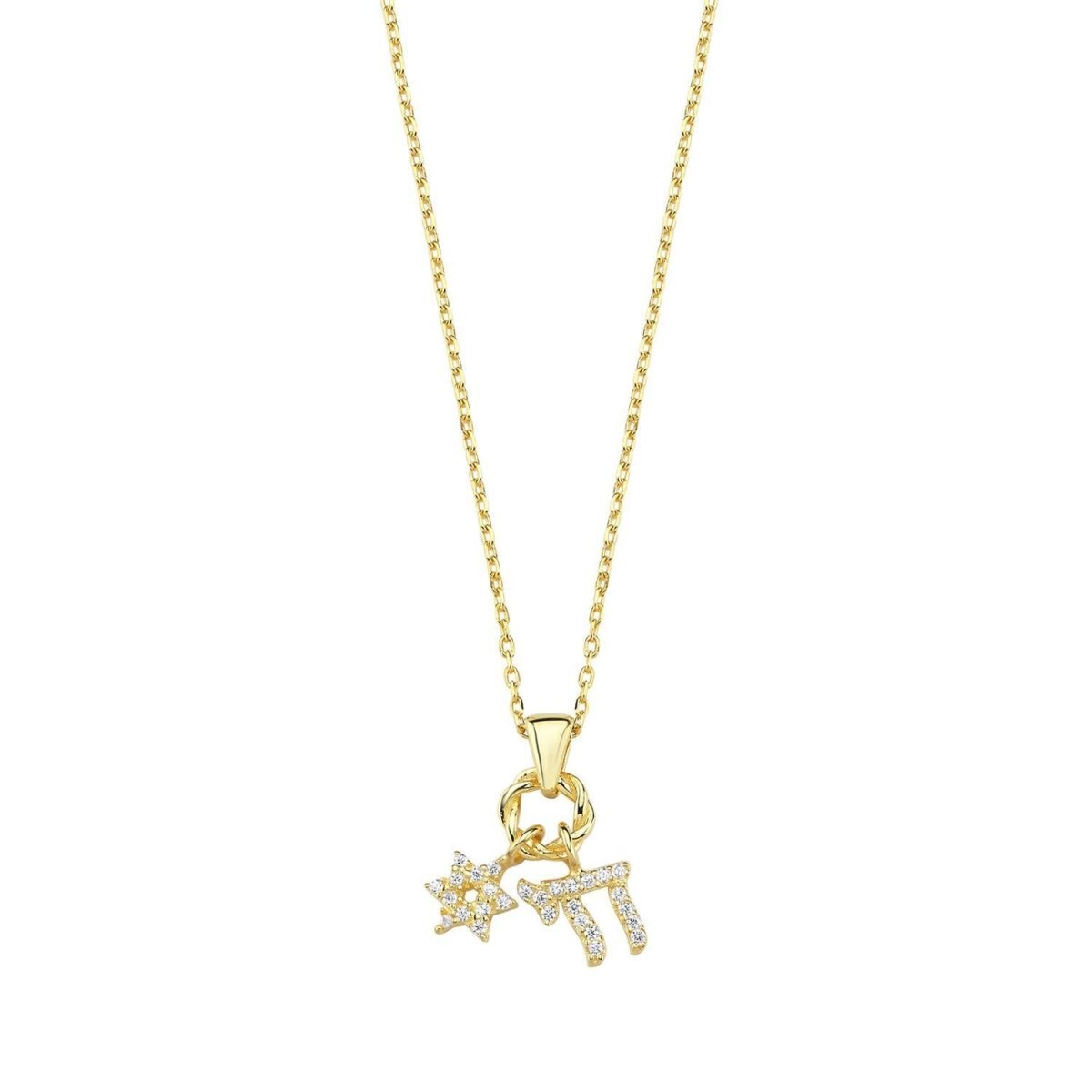 Chai and Star of David Jewish Cluster Necklace in sparkling yellow gold.