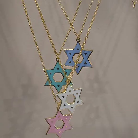 Brighten your spirit and express your heritage with our enchanting Colorful Enamel Jewish Star Necklace. This unique piece takes the iconic Star of David (Magen David) and infuses its modern outline with vibrant, smooth enamel in delightful shades like white, light blue, pastel pink, and refreshing turquoise. Crafted in beautiful gold-toned metal and suspended from a delicate yet durable matching chain, it’s a radiant celebration of tradition with a playful, contemporary twist.