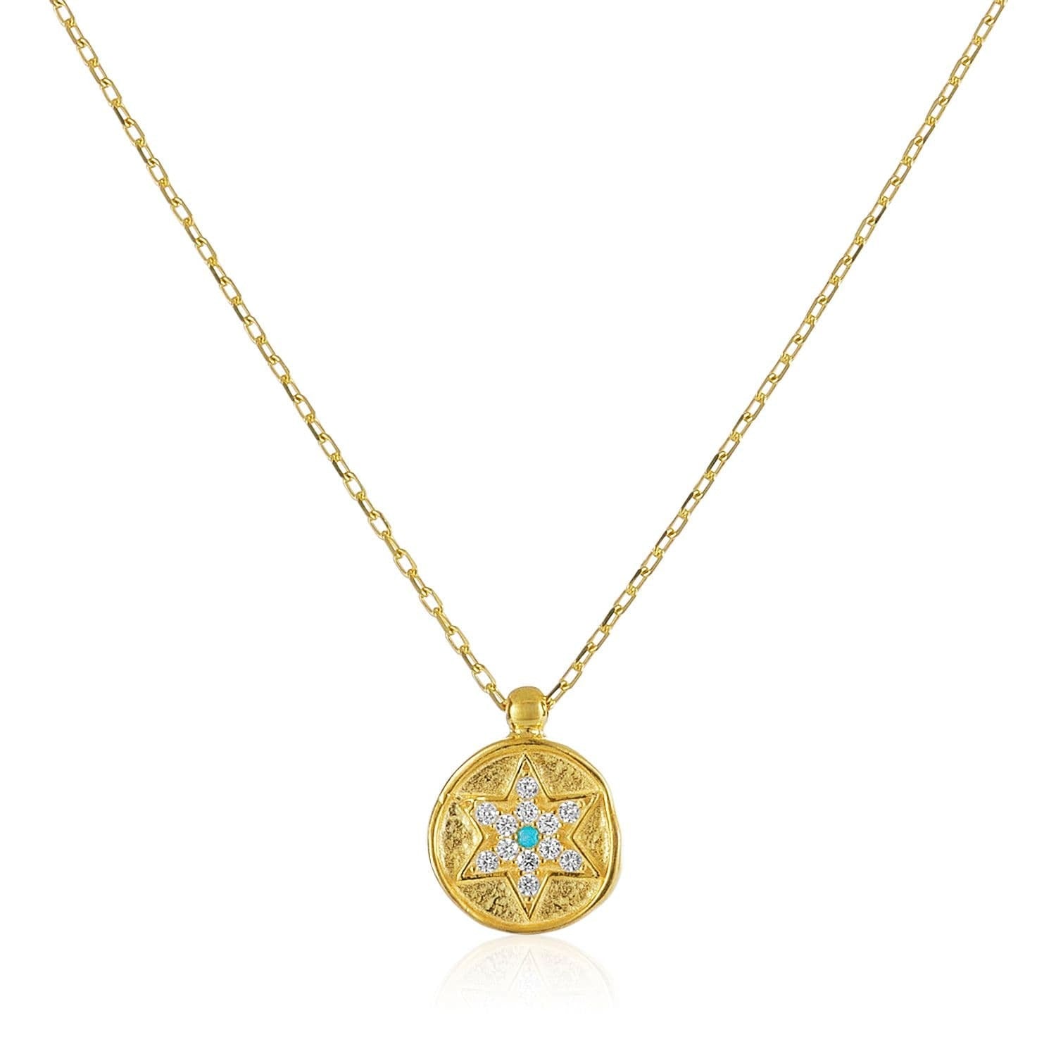 The uniqueness of this star makes it so appealing. A simple turquoise gemstone in the center of a bright Jewish star adds luck and good fortune.  It's an intricate design that you'll love.