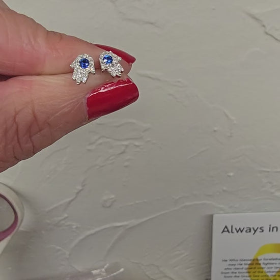 Hamsa hand diamond and sapphire earrings set in 14k gold.