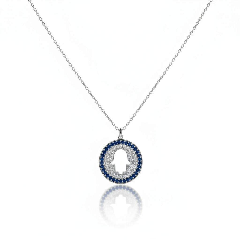 Introducing our stunning Blue & White Pave Hamsa Necklace, a beautiful blend of elegance and symbolism. Crafted from high-quality 925 Sterling Silver and gold-plated for a luxurious finish, this necklace features a mesmerizing charm adorned with sparkling cubic zirconia stones.