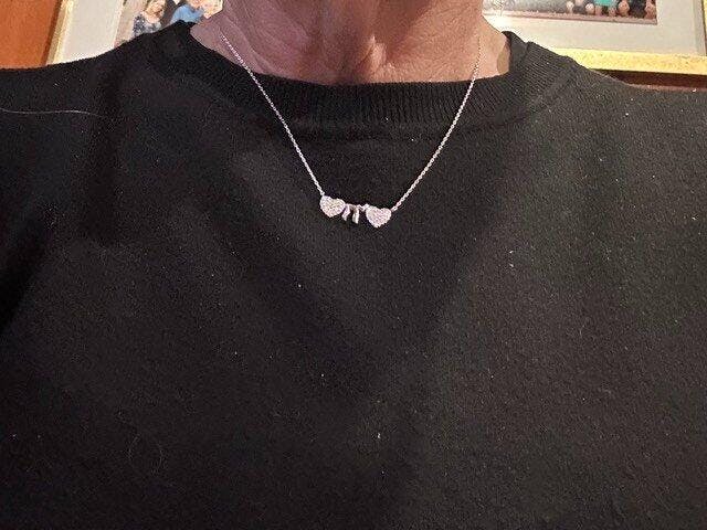 Stunning silver necklace featuring two hearts and a Chai symbol adorned with sparkling CZ gems, adjustable 16"-18" chain for perfect fit.