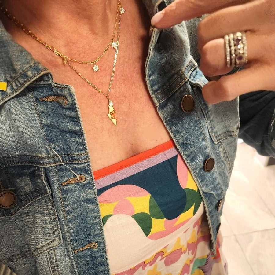 For regular cleaning, gently wipe your jewelry with a soft polishing cloth. For deeper cleaning, use mild soap and warm water with a soft brush, then rinse and dry thoroughly. Store your pieces separately to prevent scratching. Visit our Care Guide for detailed instructions on maintaining specific materials.